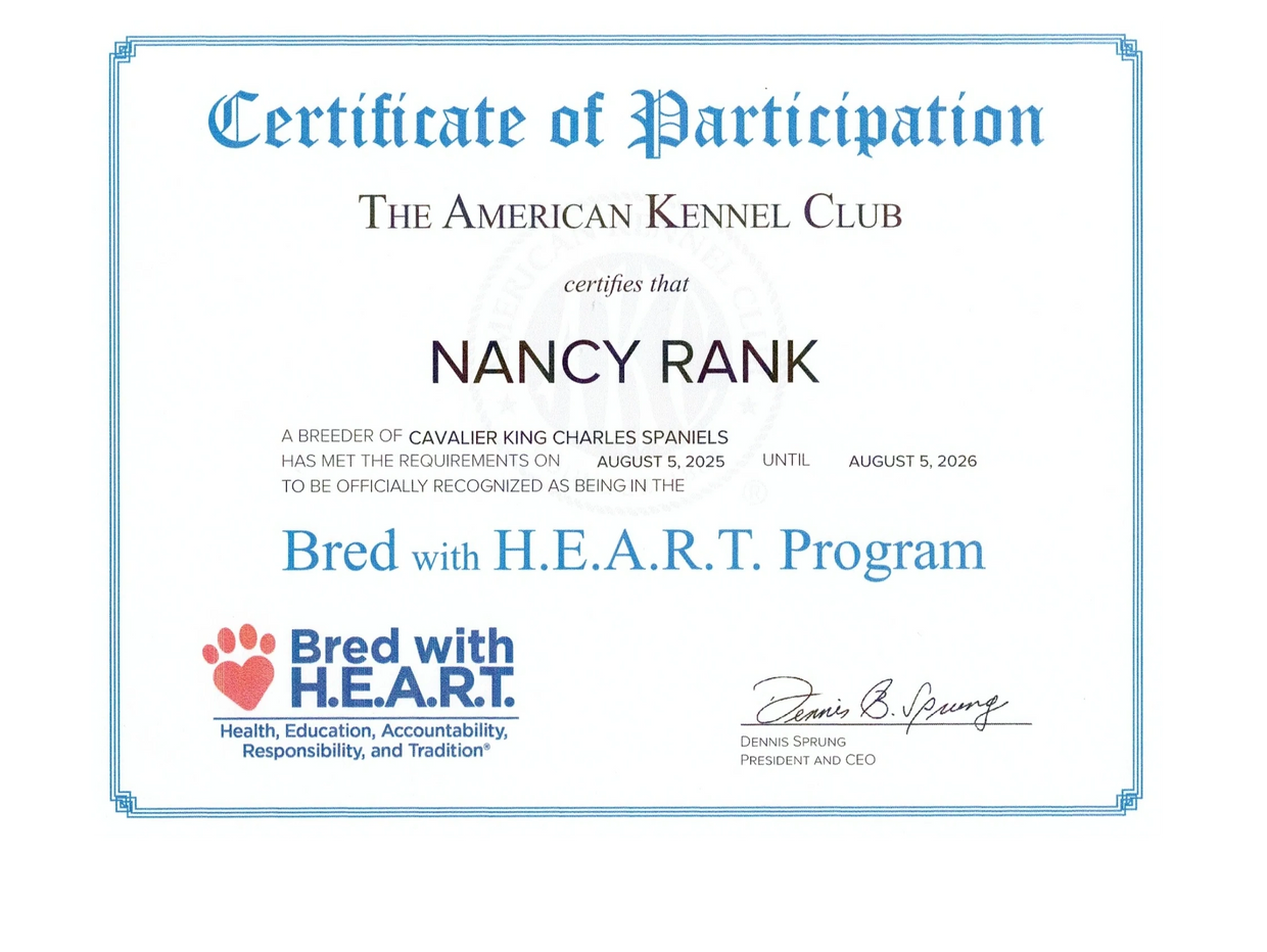We stand behind our cavalier puppies 100% and offer a 1 year health guarantee. We practice high quality standards and health testing before breeding.